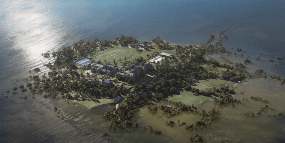 Blackbird was responsible for designing the entire geography of the island, including the cascading cliffs, high school grounds, buildings, and sports fields. They meticulously crafted varied vegetation, debris, and sediment from the tidal wave impact. Attention to detail allowed Blackbird to create an impressive digital extension with a scale typically reserved for international projects.