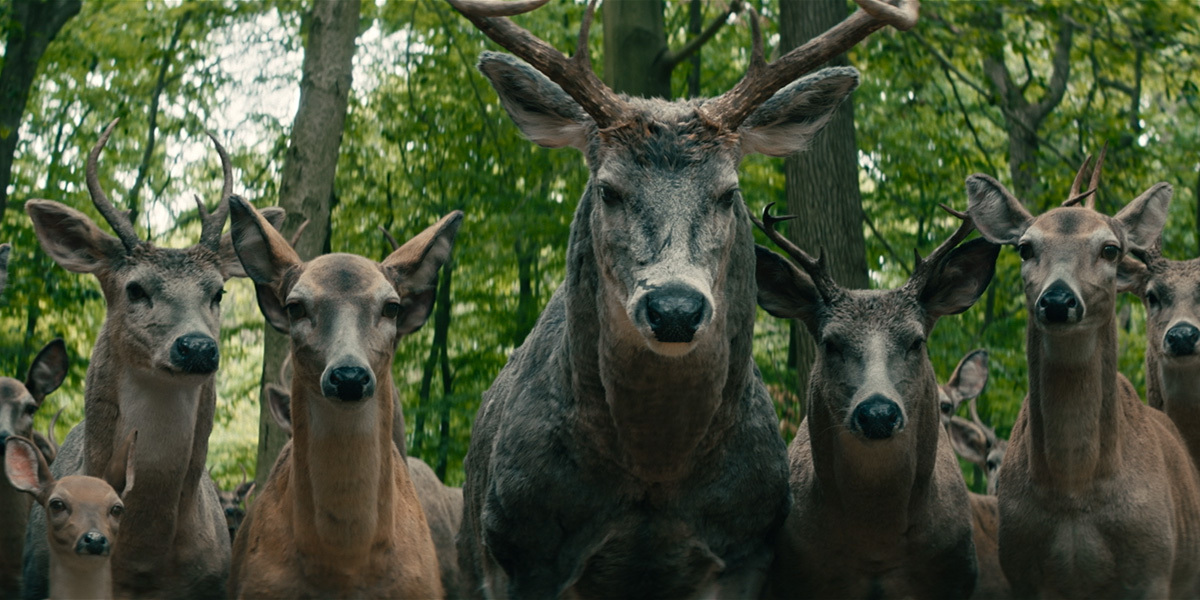 “There was one particular scene in the movie that called for a top angle shot of a large group of deer gathered outside the family’s house. That was quite a challenging scene for us to put together as it required a lot of plant reparation work, removal of some existing roads and houses, and replacing them with digital trees and foliage.”