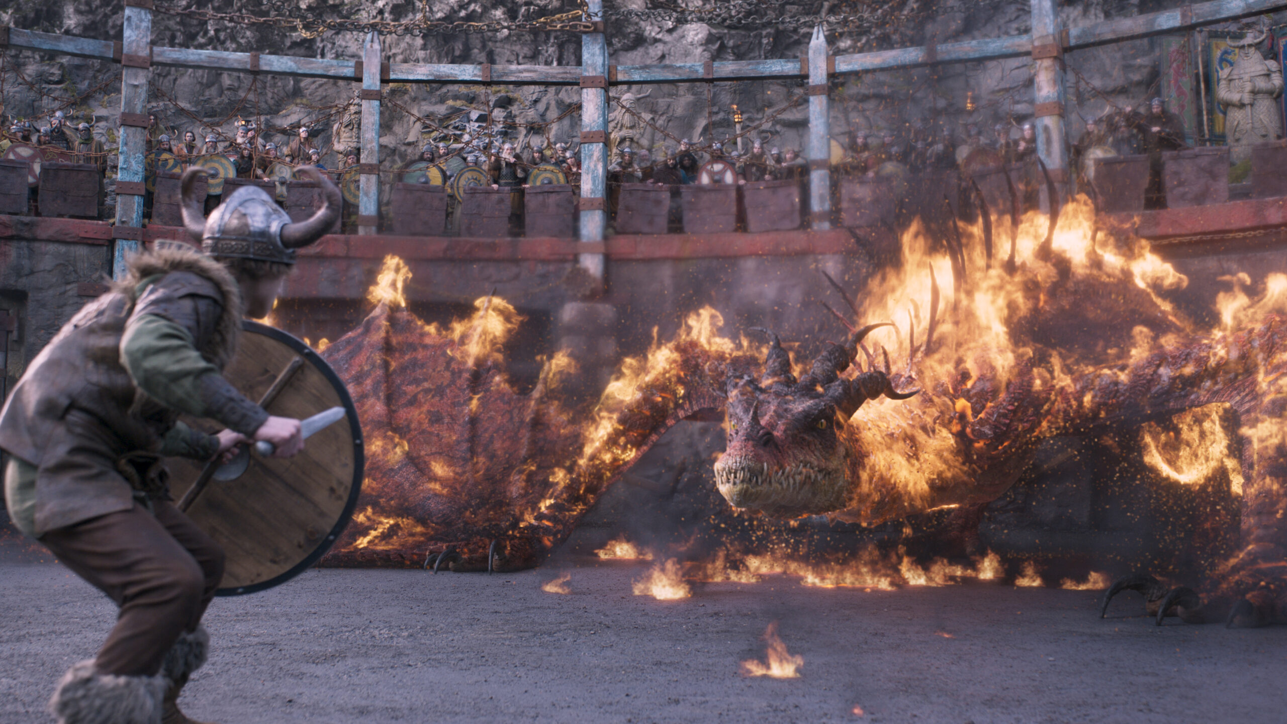 “The arena scenes are where we really start to get up close and personal with the film’s wider cast of dragons,” says VFX Supervisor Dom Hellier. “We saw them early on in the film where they rampaged through the Viking village, but this is where we get a sense of their different characteristics and, crucially, set up the connections they’ll have with their respective Vikings later in the film.” These scenes see the film’s young, would-be dragon slayers pitted against the different dragon types – the Monstrous Nightmare, Deadly Nadder, Gruesome Gronckle, Hideous Zippleback and Terrible Terror – across a series of challenges to help them better fend off their scaly foes.